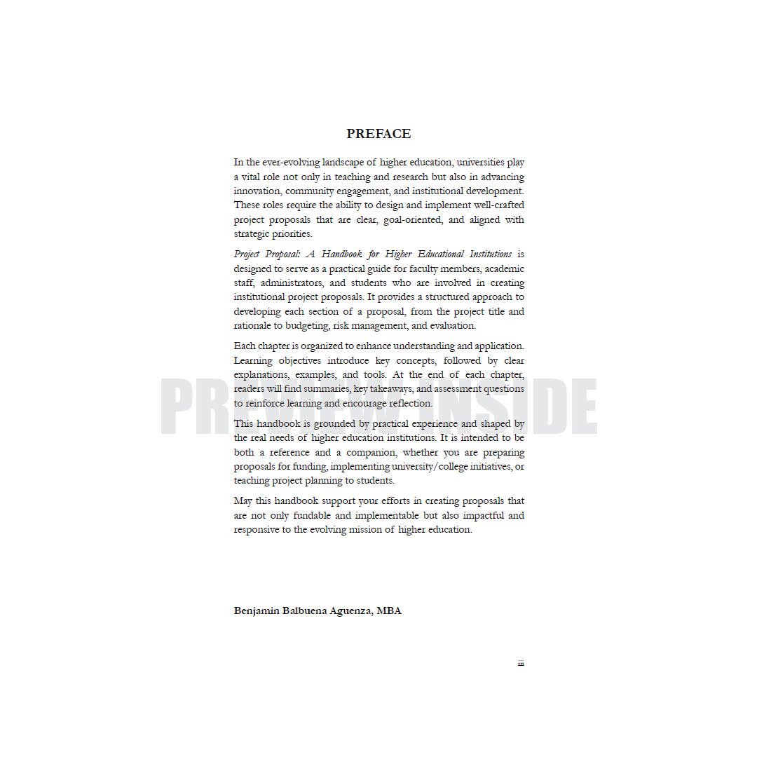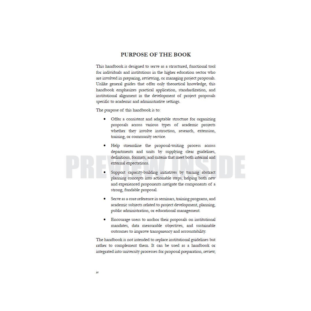 Project Proposal: A Handbook for Higher Educational Institutions is designed to serve as a practical guide for faculty members, academic staff, administrators, and students who are involved in creating institutional project proposals. It provides a structured approach to developing each section of a proposal, from the project title and rationale to budgeting, risk management, and evaluation.