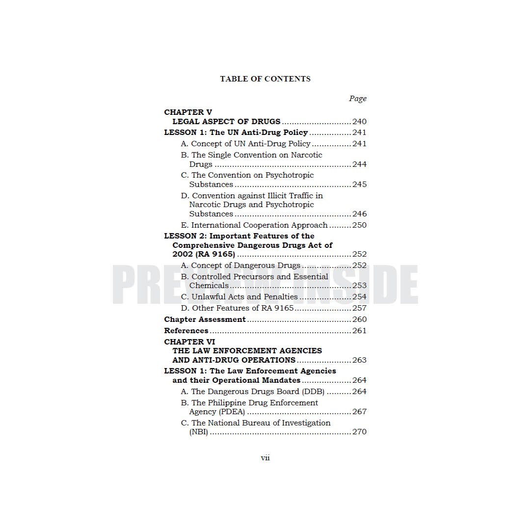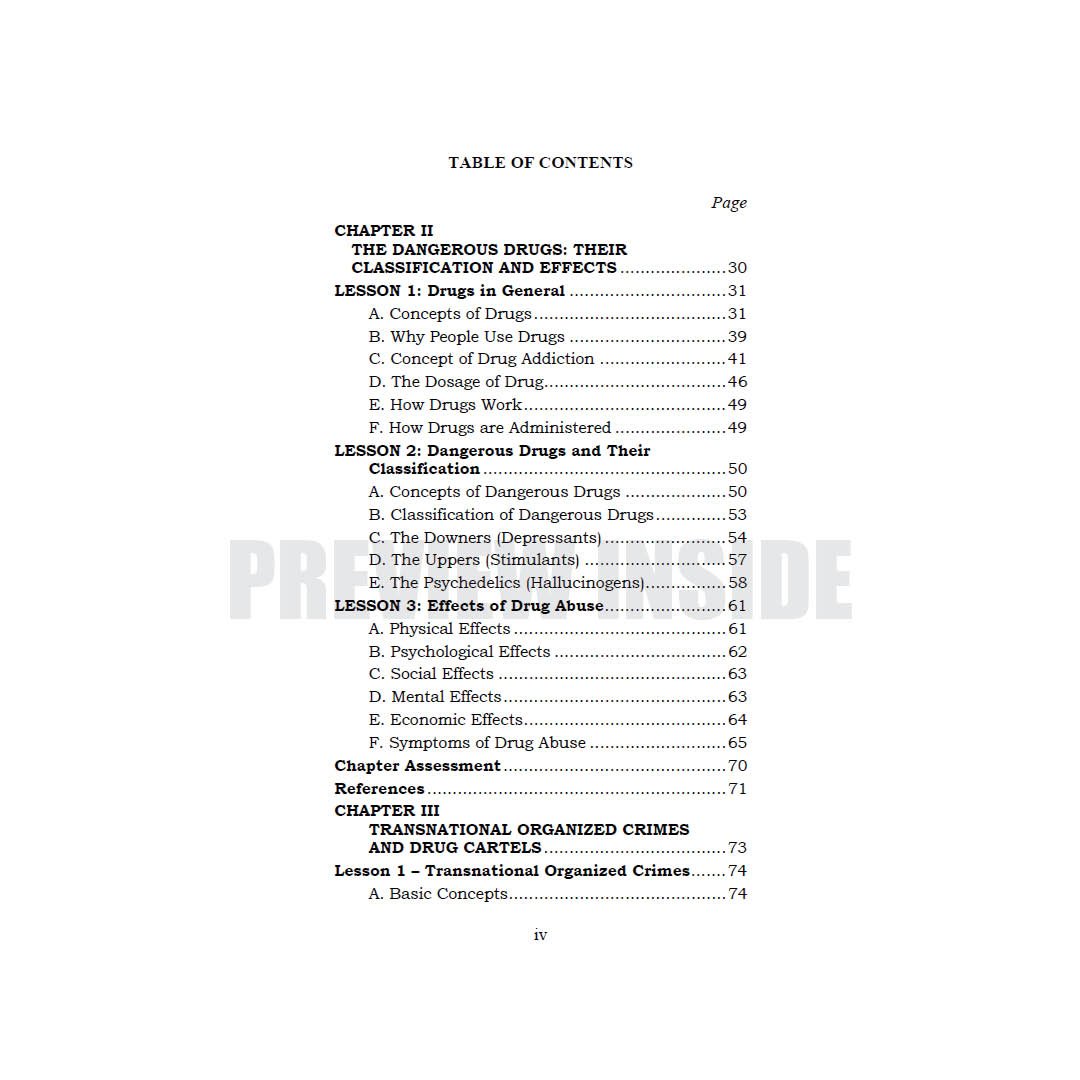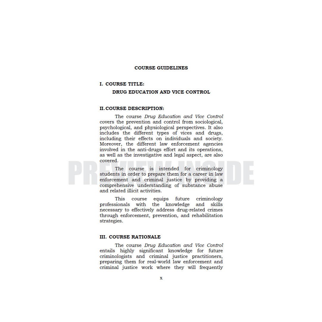 The course Drug Education and Vice Control covers the prevention and control from sociological, psychological, and physiological perspectives. It also includes the different types of vices and drugs, including their effects on individuals and society. Moreover, the different law enforcement agencies involved in the anti-drugs effort and its operations, as well as the investigative and legal aspect, are also covered.