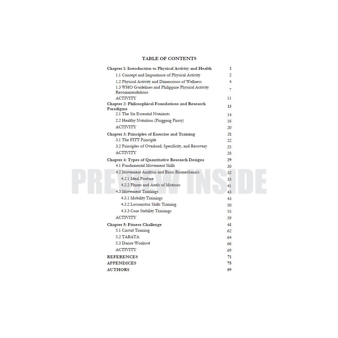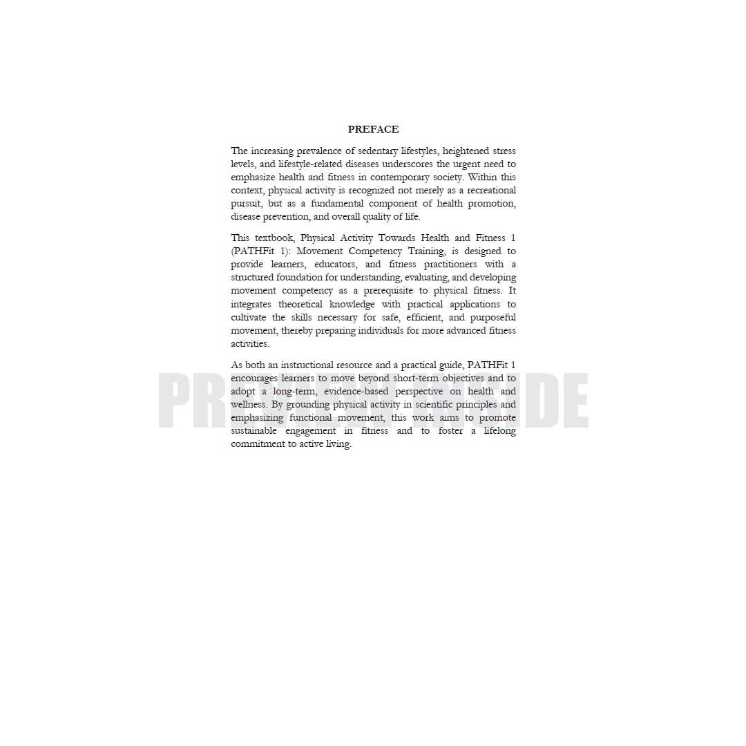 This textbook, Physical Activity Towards Health and Fitness 1 (PATHFit 1): Movement Competency Training, is designed to provide learners, educators, and fitness practitioners with a structured foundation for understanding, evaluating, and developing movement competency as a prerequisite to physical fitness. It integrates theoretical knowledge with practical applications to cultivate the skills necessary for safe, efficient, and purposeful movement, thereby preparing individuals for more advanced fitness activities.
