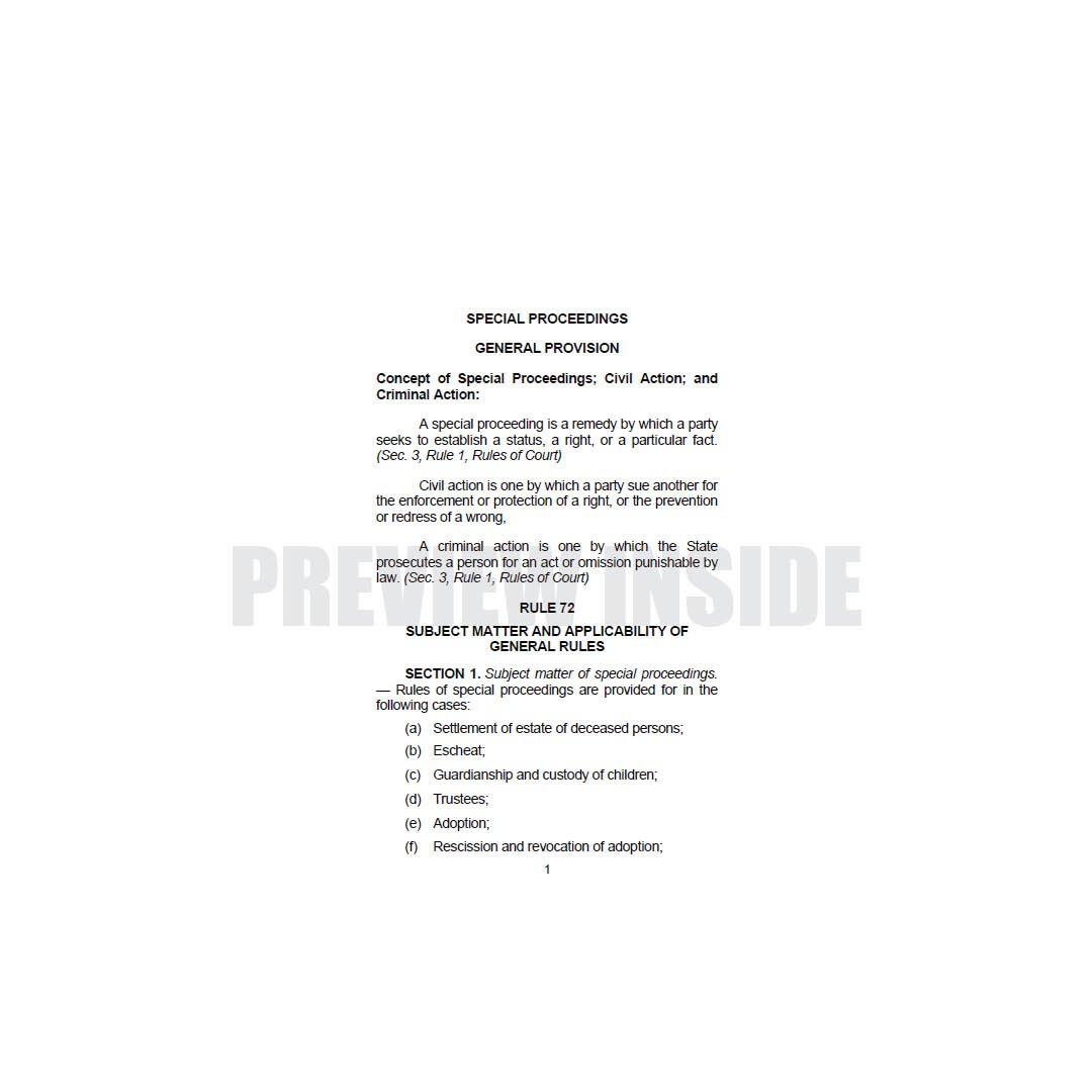 This book is crafted in a simplified form and concise manner. It is intended to simplify the study of the Rules on Special Proceedings and other related laws as a supplementary reading material for the students of law, bar candidates, and bar practitioners.