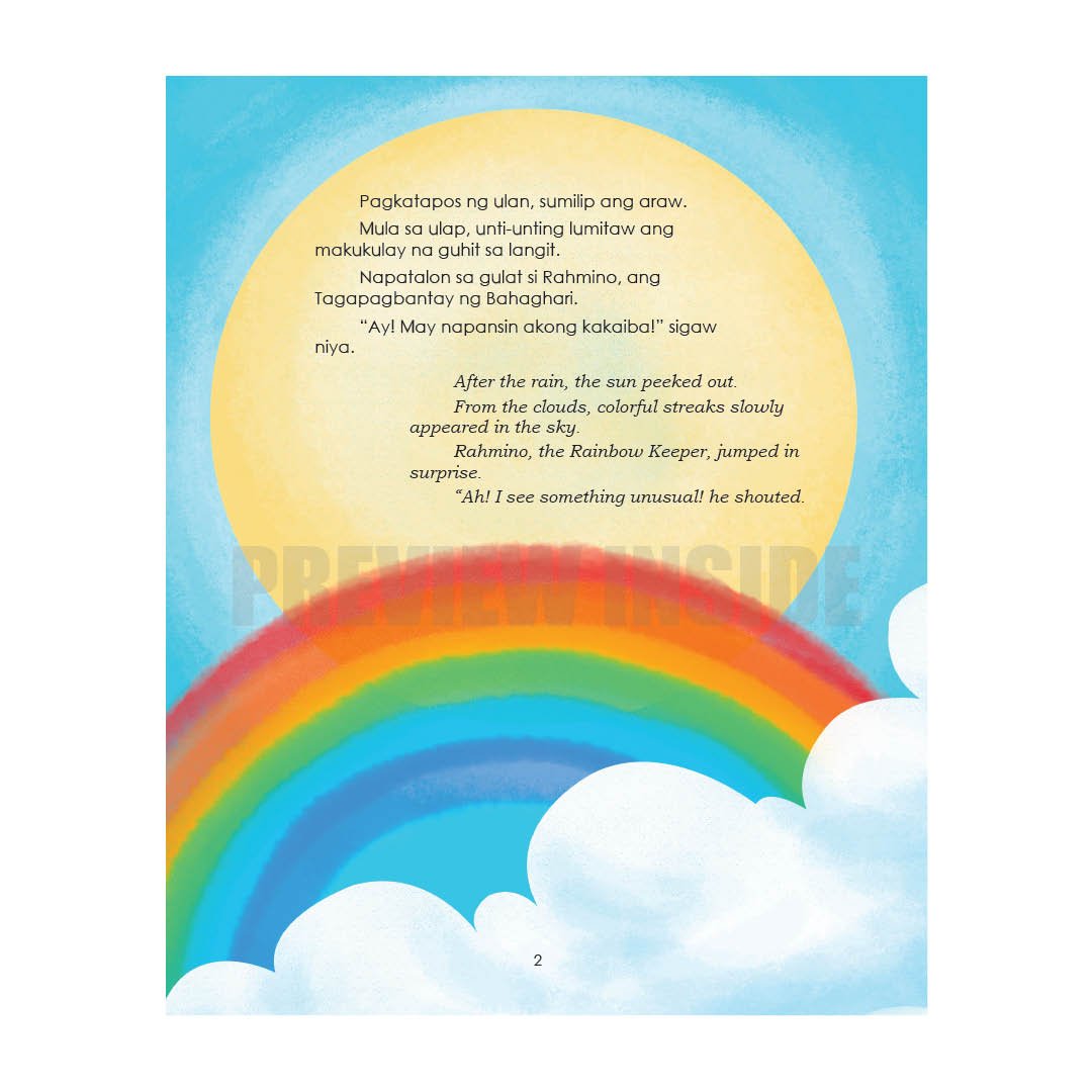 Pagkatapos ng ulan, may napansing kakaiba si Rahmino, ang Tagapagbantay ng Bahaghari—may isang kulay na nawawala! Habang nag-aalala siya, isa-isa namang nagpakilala ang ibang kulay na nananatili sa langit. Ngunit sa likod ng makapal na ulap, may isang kulay na nagtatago at nagdududa sa sarili. Mabubuo kaya muli ang bahaghari kapag natagpuan ang nawawalang kulay?