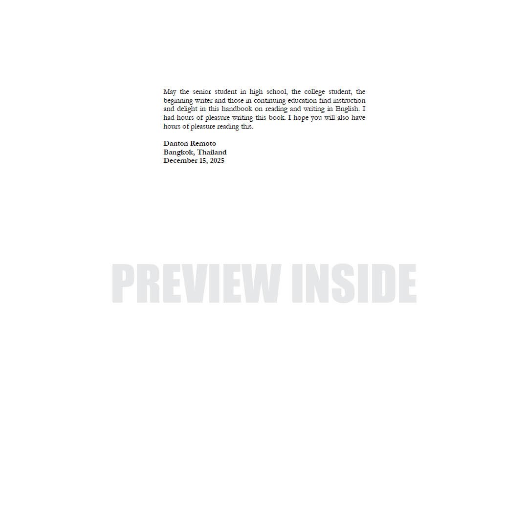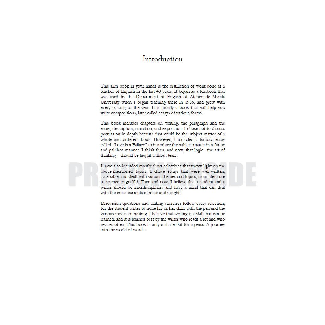 This slim book in your hands is the distillation of work done as a teacher of English in the last 40 years. It began as a textbook that was used by the Department of English of Ateneo de Manila University when I began teaching there in 1986, and grew with every passing of the year. It is mostly a book that will help you write compositions, later called essays of various forms.