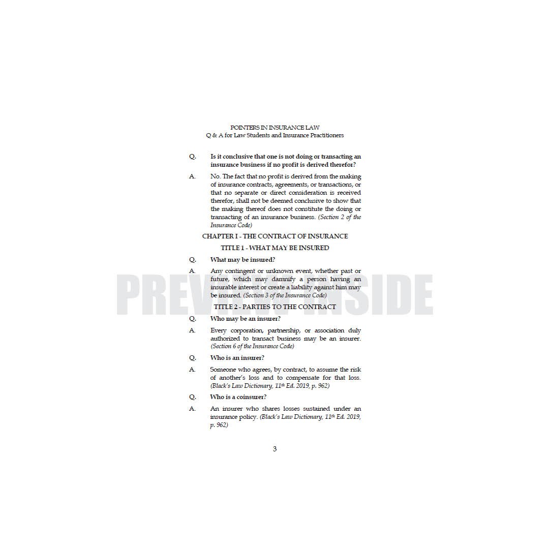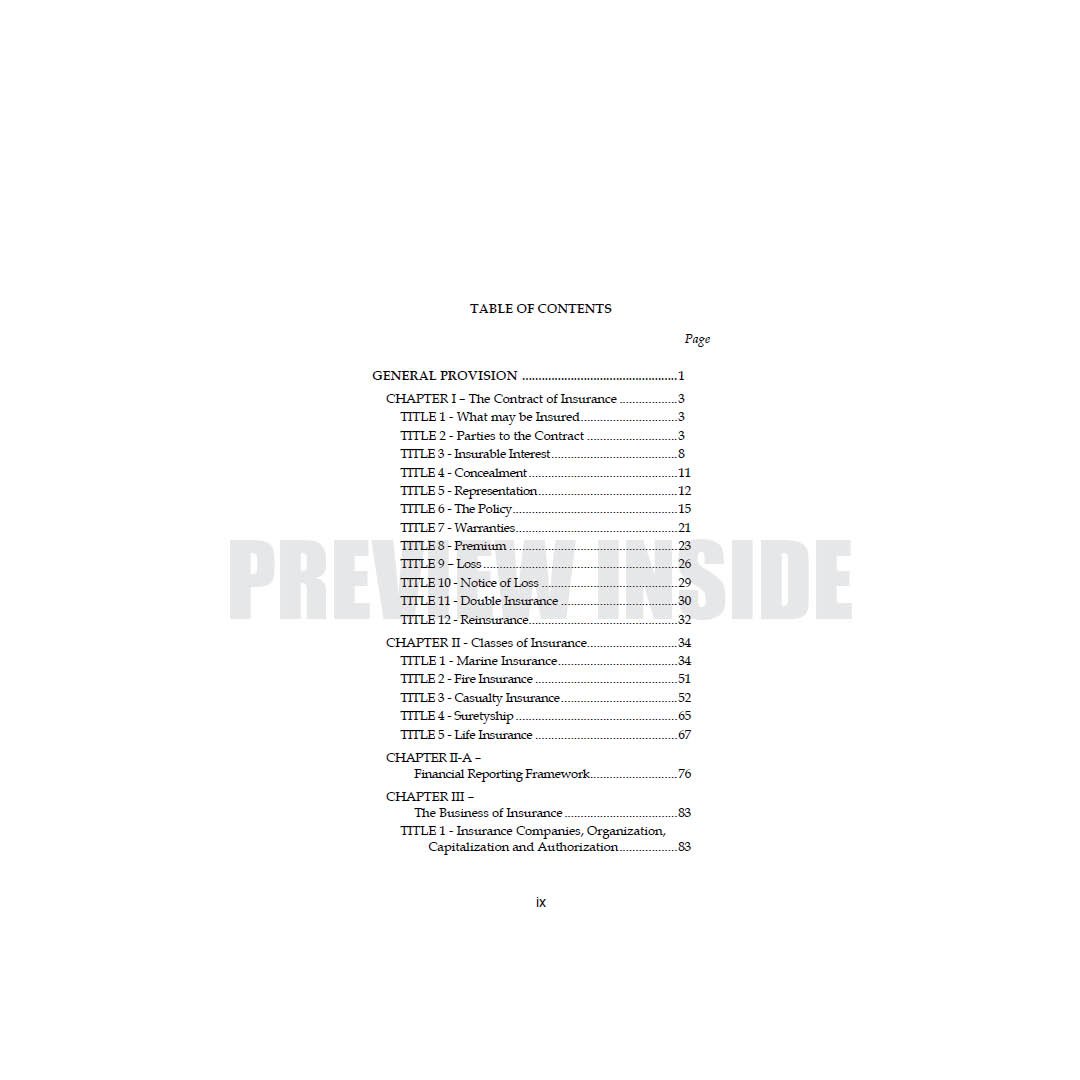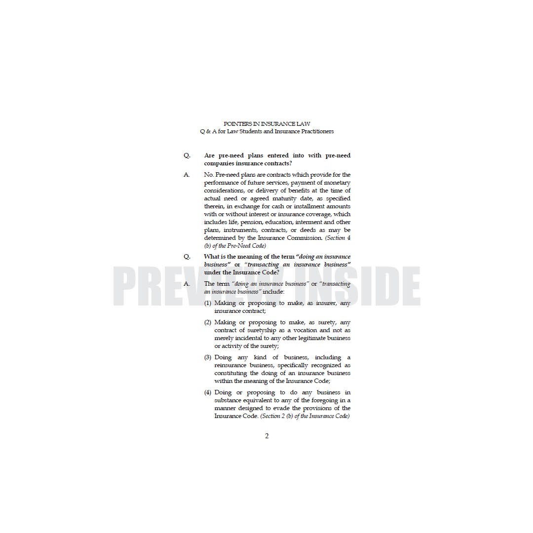This book is especially designed for law students and insurance practitioners. The manner of presentation is user-friendly question-and-answer format. This work includes latest decisions of the Supreme Court on Insurance Law and recent circulars of the Insurance Commission in major areas, including: licensing; corporate governance; merger and consolidation; and conservatorship, receivership and liquidation. The Rules of Procedure for Administrative Cases and Monetary Claims Adjudication of the Insurance Commission are discussed and incorporated. The authors also included the List of Fees and Charges and List of Submissions in the Insurance Commission for ready reference.