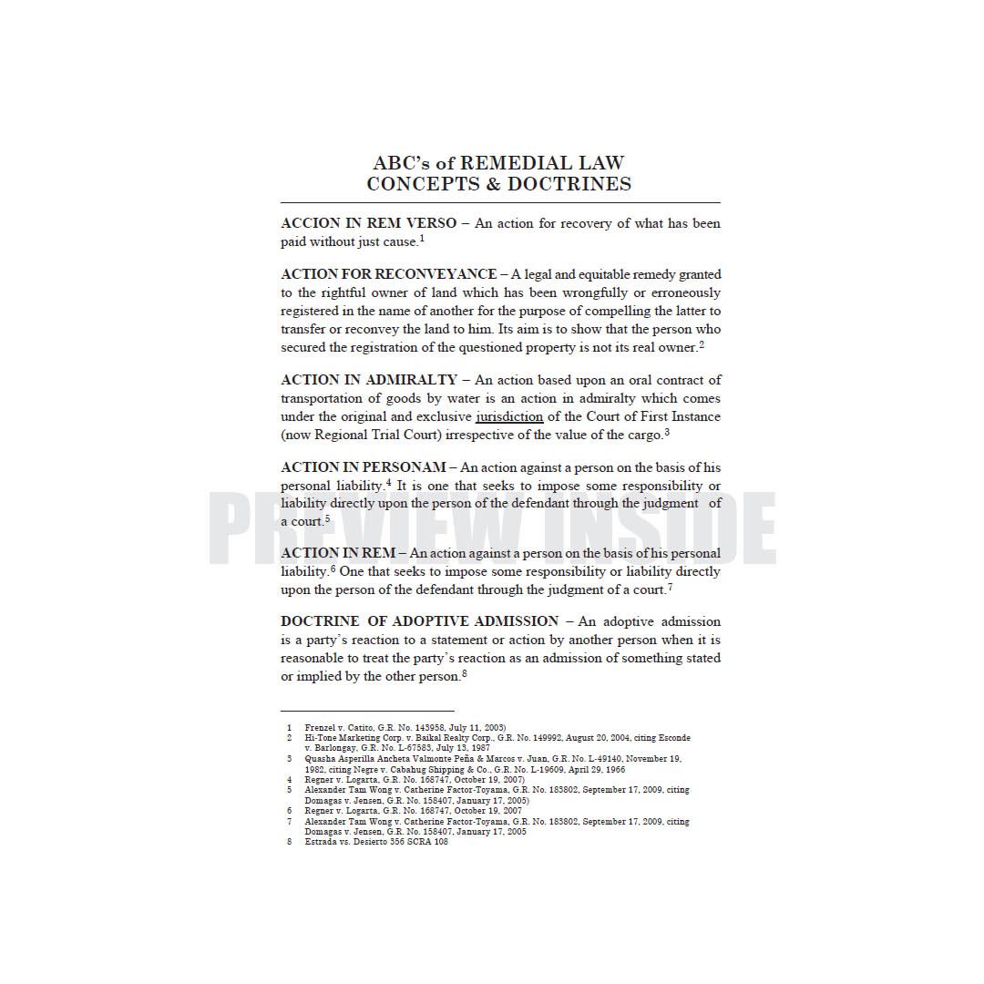 Remedial Law reviewer is vital for simplifying complex procedural rules and jurisprudence for bar candidates. Judge Janice L. Andrade-Udarbe’s book responds to this demand and concerns. Her book is a syllabus-based, concise and complete guide to facilitate in the review of Civil Procedure, Criminal Procedure, Special Proceedings, and Evidence. The handbook provides a comprehensive review of important rules and doctrines as well as relevant cases for the Bar Examinations.